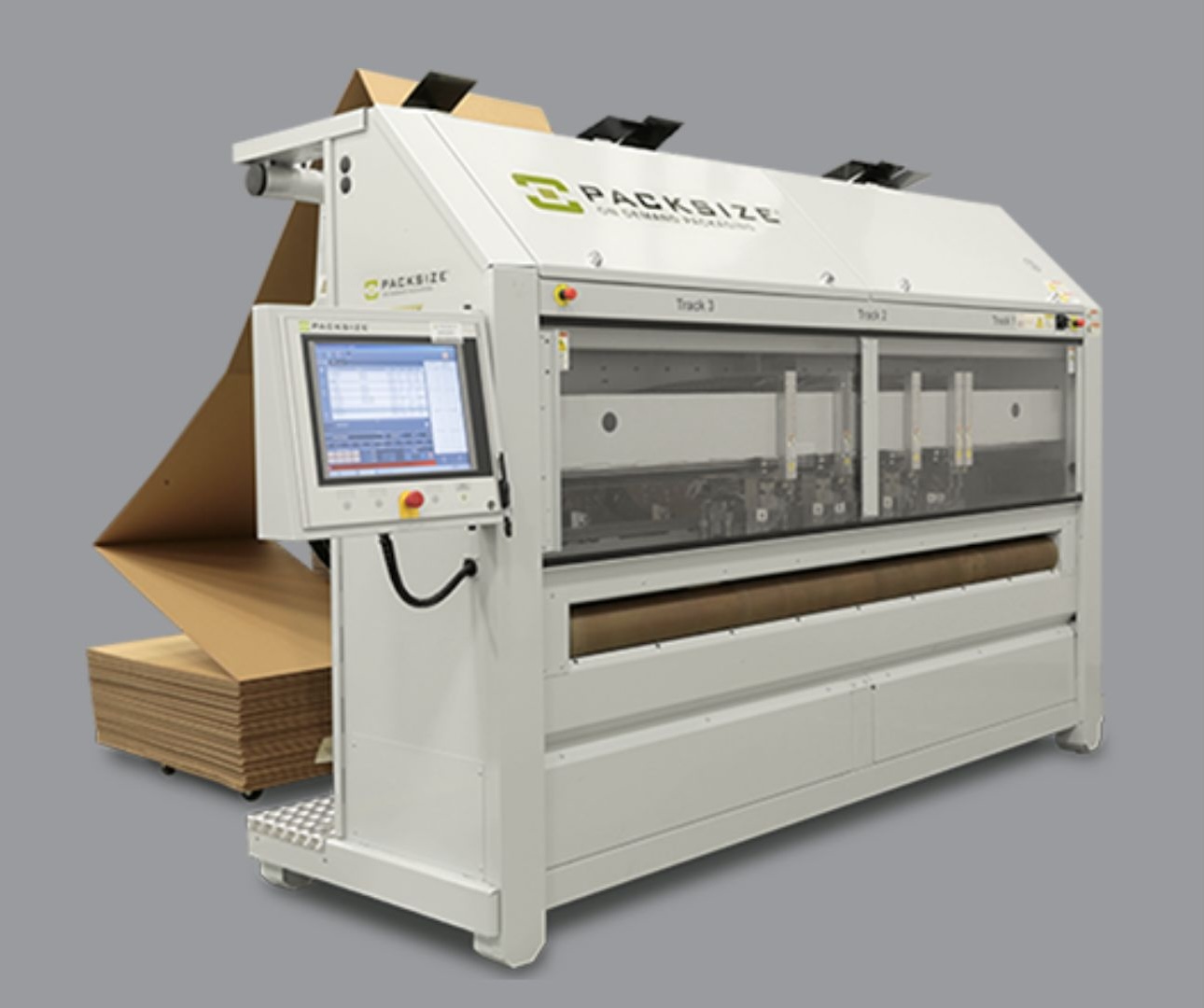 The Packsize machine. Our custom box-cutting technology right-sizes every package to fit its contents. The result: 60% less void fill, a 28% average reduction in box size, and a 28% reduction in corrugate usage. We also shred the leftover corrugated scraps from this process into cushioning material — so even our waste becomes useful.